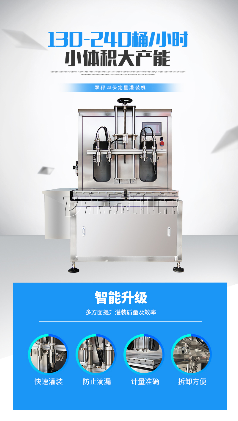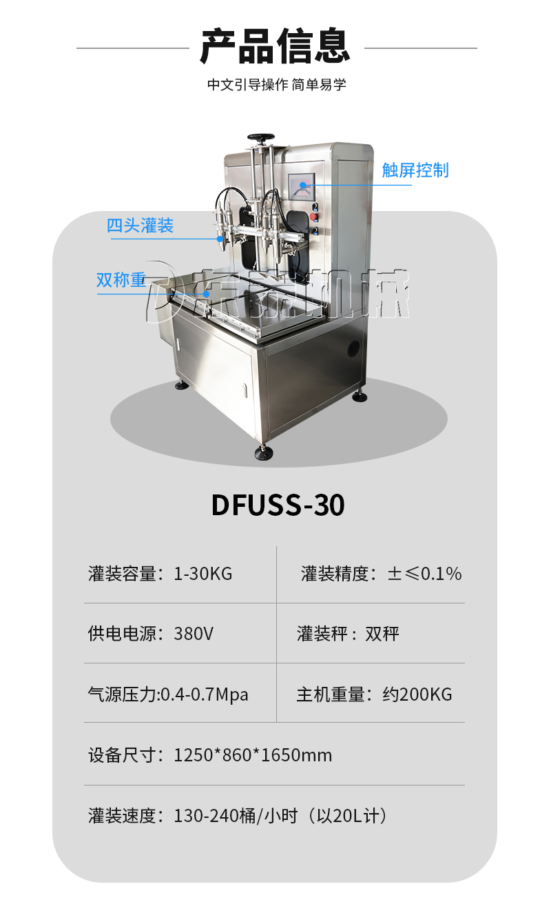 產品名稱:雙秤四頭定量灌裝機 型號:DFUSS-30 產品說明:   該灌裝機適用于各種油類以及粘稠液體的灌裝。如:潤滑油、防凍液、化工原料等   &nbs
