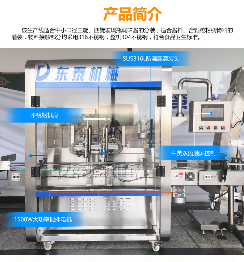 牛肉醬定量灌裝機設(shè)備采用臺灣臺達PLC控制系統(tǒng),人機界面,基恩士監(jiān)測點,品牌電氣配件,在工作運行中十分穩(wěn)定。自動抽真空旋蓋于一體,自動化程度高;其旋蓋扭力及真空度可按需設(shè)定,可確保真空度達標。東泰創(chuàng)新推出的這款牛肉醬定量灌裝機設(shè)備適用于多種圓形瓶子旋蓋,兼容性強;該設(shè)備采用不銹鋼設(shè)計,各部件調(diào)節(jié)方便,保證食品安全的同時,為消費者帶來很好食品安全保障。該設(shè)備采用的電器和氣動元件,使設(shè)備性能穩(wěn)定,可靠,耐用。牛肉醬定量灌裝機設(shè)備操作程序優(yōu)化,根據(jù)客戶灌裝不同規(guī)格,不同密度的物料時,參數(shù)可預(yù)設(shè)存儲,使用時一鍵切換,操作更加簡單方便,同時降低了對操作工人的技術(shù)能力要求。
